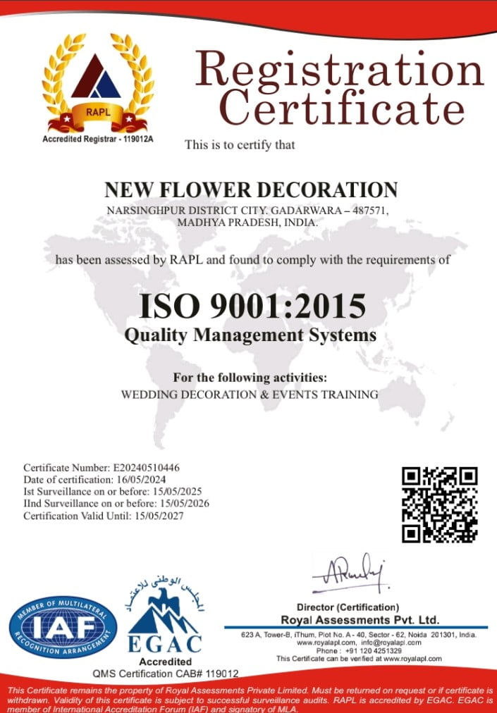 New Flower Decoration helps you in all events and training like tent decoration, flower decoration, balloon decoration, fire work, light decoration etc. and this training is fully certified by ISO.